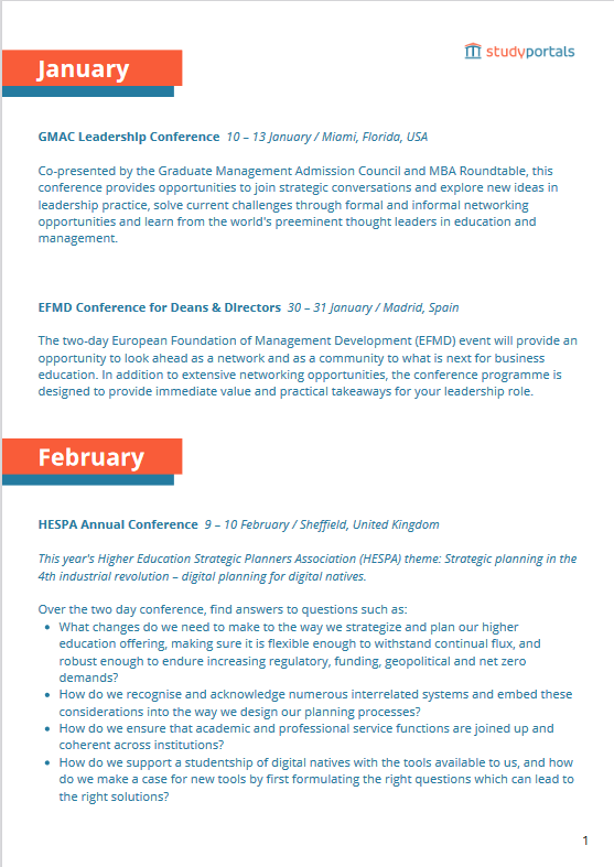 Higher education conferences 2023 guide: For a last push of the year, we decided to create a guide that had a compact overview of the higher education conferences that are occurring in 2023 as well as what can be expected at each conference. They were sorted by date and organized in a PDF that could be downloaded. My task was researching the conferences, updating their info, and listing them within a document so that they could be inserted into a nicer PDF format. This guide was so well received over 150 downloads that we are going to be creating this again for 2024.