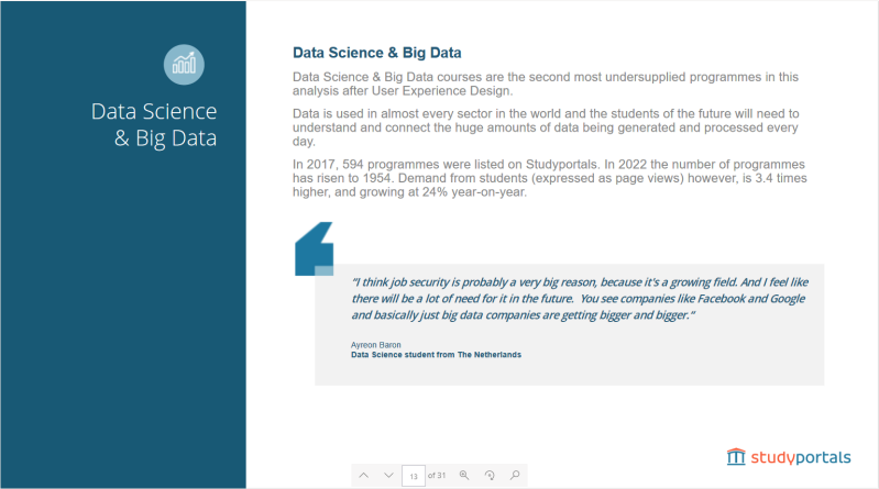 Upcoming Sub-disciplines for 2023 report: One of the larger reports I was able to work on was our Sub-discipline report for upcoming topics schools should be looking out for. To bring more authenticity to the report and show that Studyportals is hands on with students, I interviewed several students in the varying subjects to get their opinion on the increase of interest. These interviews were then utilized in the report and will be used again in the future for other projects.