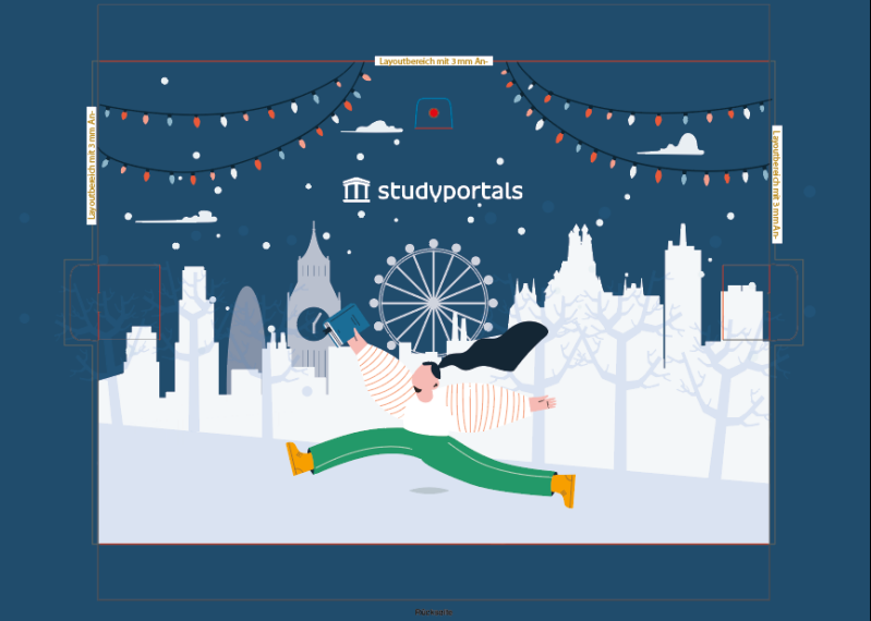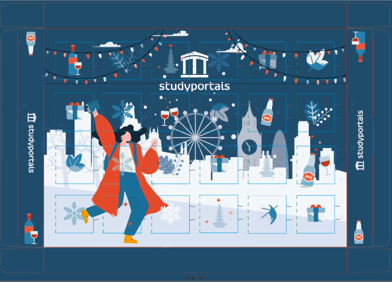 Advent calendars for clients: To celebrate the upcoming Christmas season, I was tasked with creating an advent calendar for clients in the UK region. For this, I created a project plan and coordinated efforts between University Marketing and the UKI team. The end result was 100 custom designed advent calendars shipped to these clients, each fitted with a note wishing them a happy holiday season from Studyportals and their matching account owner.