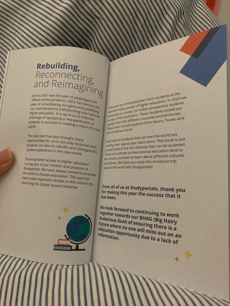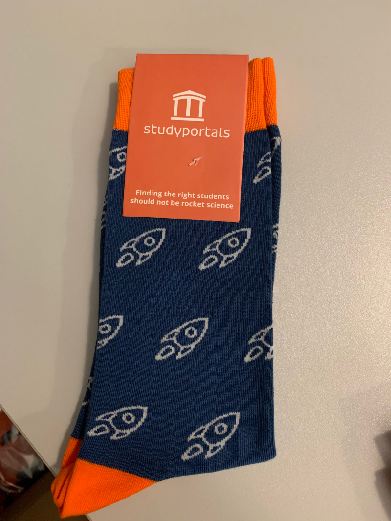 Christmas socks for client gift: For this project, a client gift needed to be created to show our appreciation of our clients at the end of the year. Ideas needed to be brainstormed and a final product created. As a team, we decided on a pocket guide with fun facts and a pair of custom Studyportals socks. I took the lead on the socks creation and made it my main project. For this, I had to research where we could find custom socks within our budget range, work with our team designer on a design for the socks and the label, come up with a copy for the label, and coordinate with the company (Sokkies) to ensure that the product came on time and was in good condition. The socks took quite some time but resulted in beautiful socks that clients and the company loved! This end of year gift project concluded with a highly coordinated packing week in which we separated clients by country, collected individualized messages, and packed the gift sets to be shipped out before the end of the year.